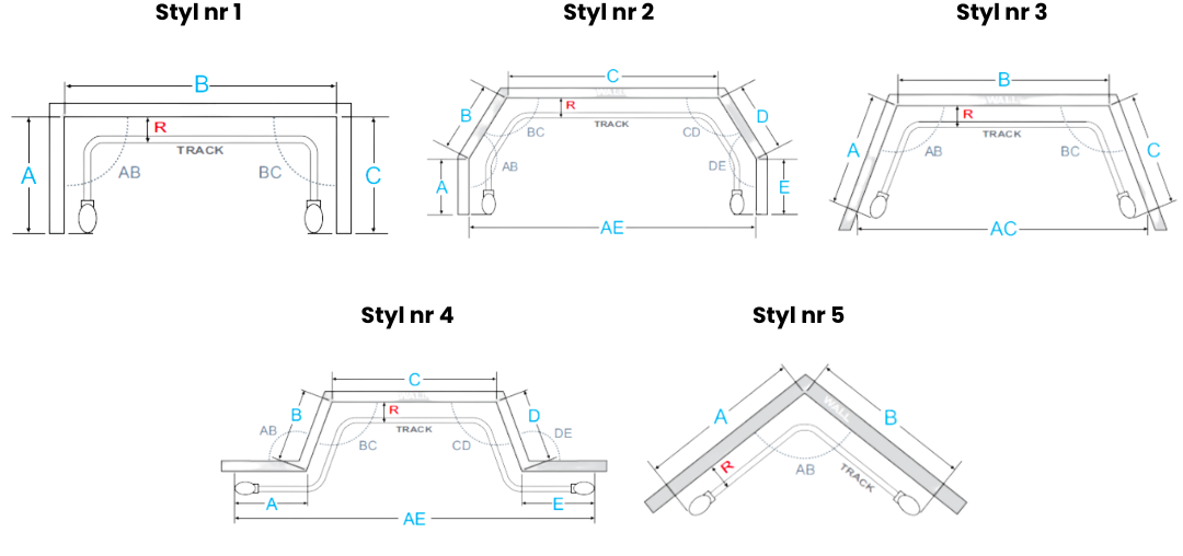 W naszej ofercie znajdziesz pięć różnych styli gięcia szyn, które dostosowane są do różnych potrzeb aranżacyjnych. Każdy styl odpowiada innym wymaganiom przestrzennym i estetycznym, a grafika, którą dla Ciebie przygotowaliśmy, pokaże wszystkie dostępne opcje w przejrzysty sposób. Niezależnie od tego, czy potrzebujesz gięcia w kształcie łuku czy bardziej skomplikowanych układów – jesteśmy gotowi sprostać Twoim oczekiwaniom.