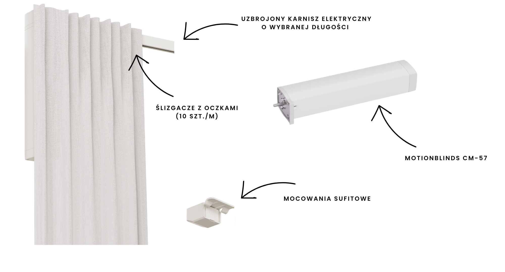 - Posiada jednostkę napędową Motionblinds CM-57 zakończoną wtyczką. Silnik gwarantuje płynny przesuw zasłon,