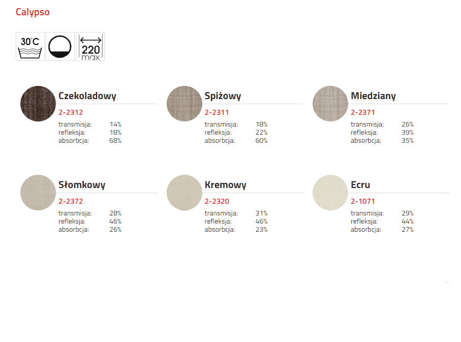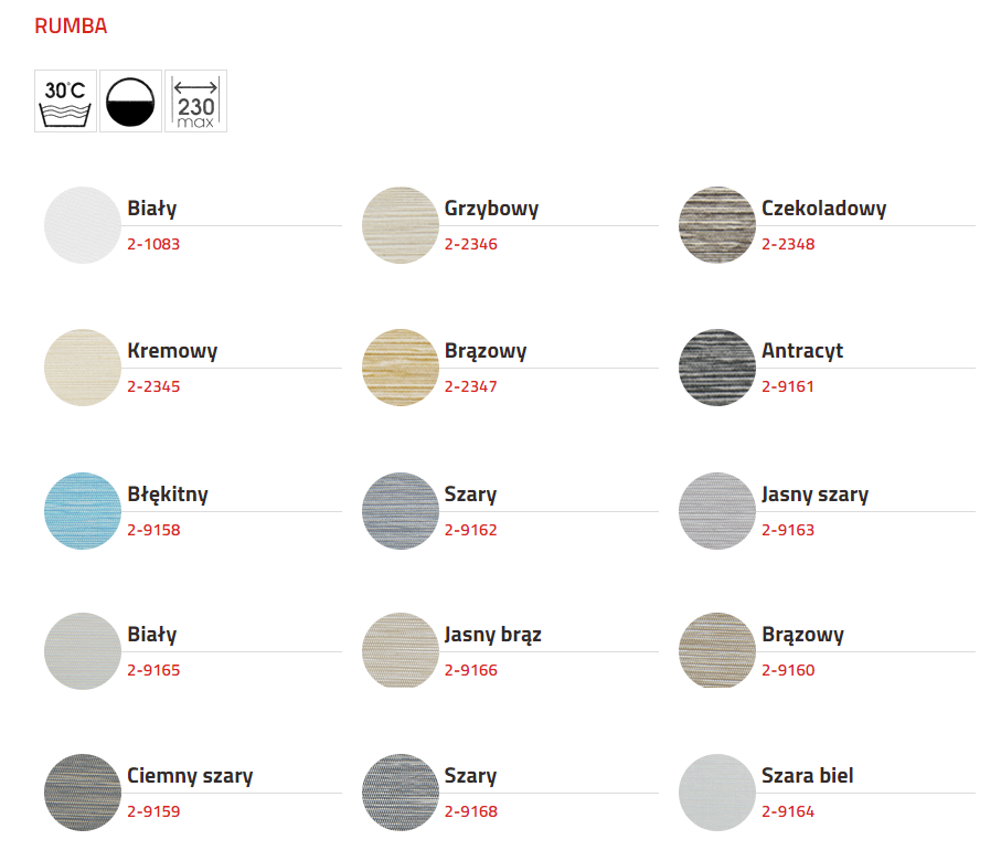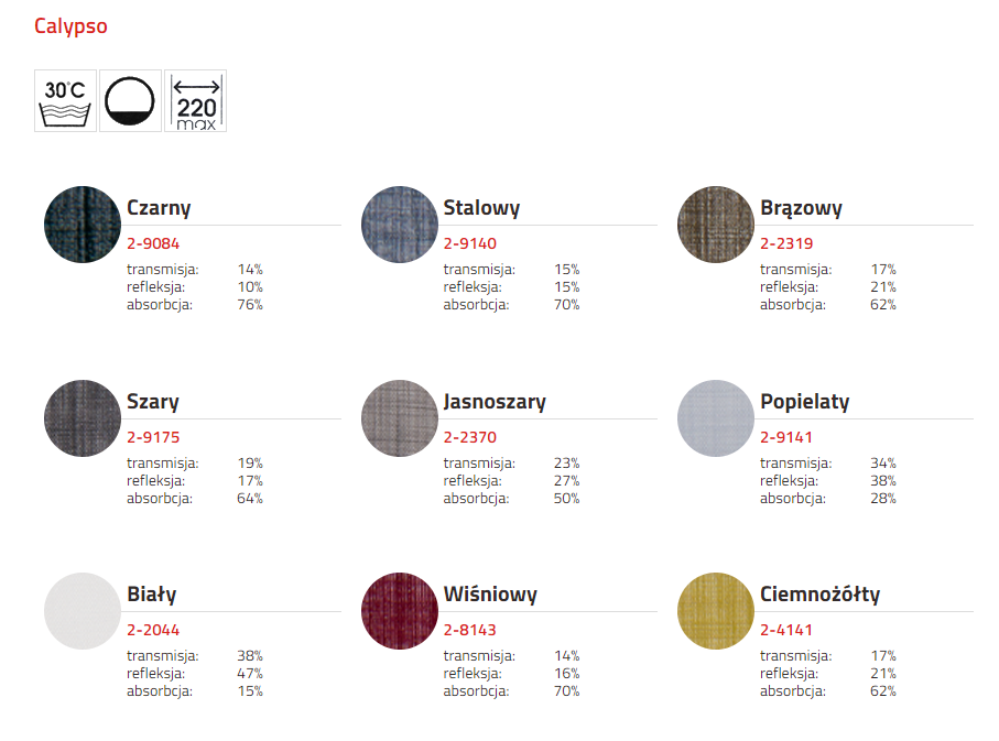 - bardzo szeroki oferta jakościowych tkanin niemieckich (przepuszczające światło, zaciemniające, wzorzyste, typu screen, materiały z atestem trudnopalności, materiały wodoodporne),