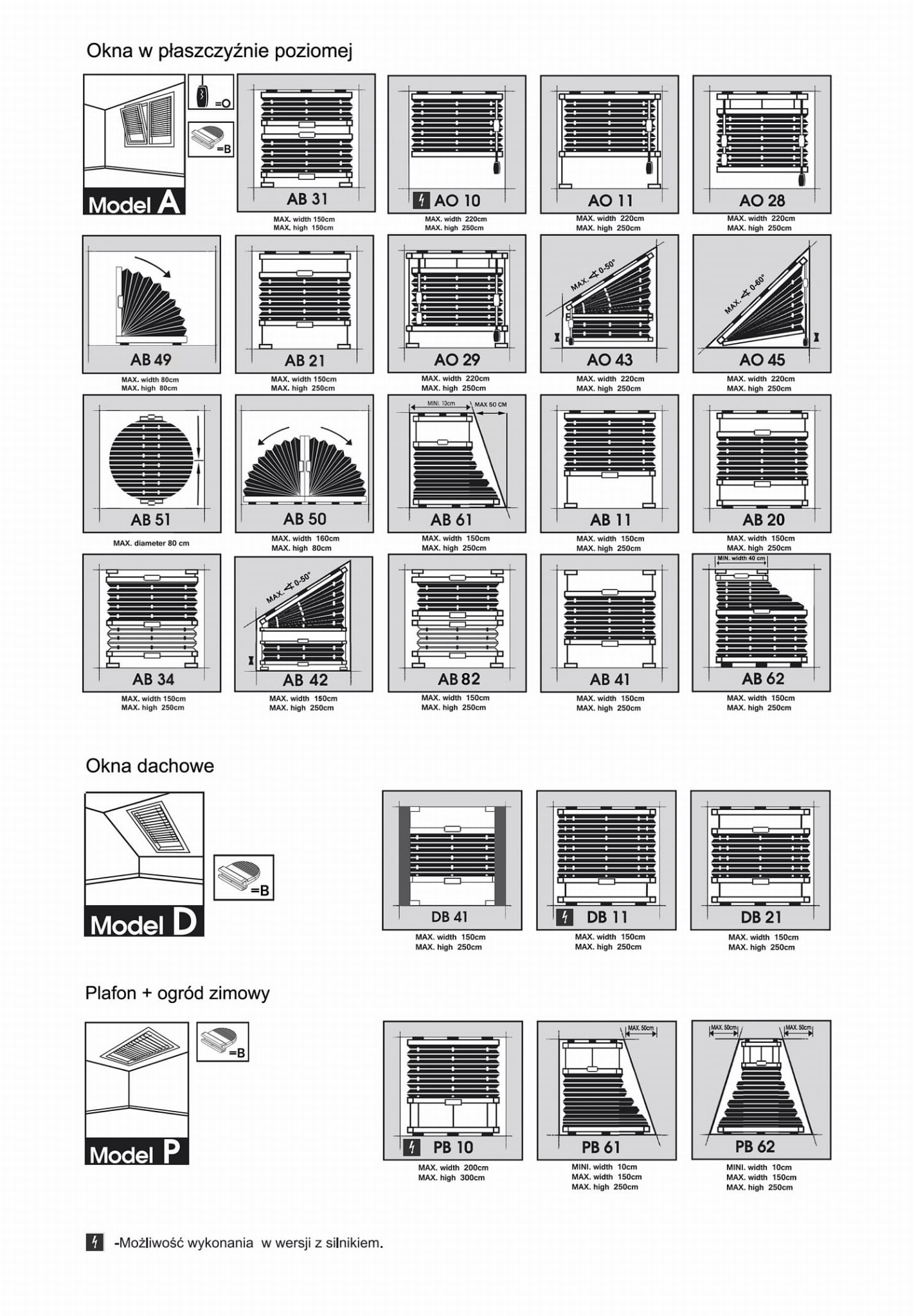 Standardowe modele rolet plisowanych to AB41 i AB11. Maksymalne wymiary plis w tych modelach to szerokość do 160 cm, wysokość do 260 cm i powierzchnia do 2 m2.