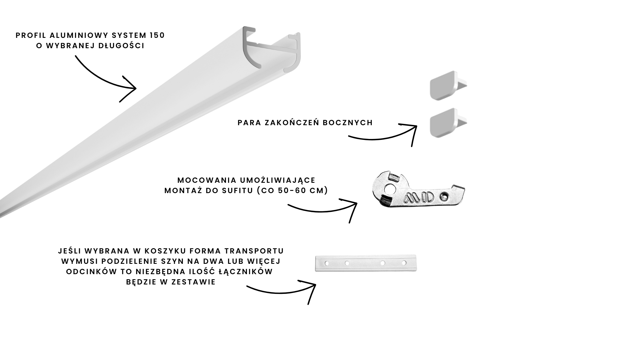 System 150 to pewność wysokiej jakości, estetyki i funkcjonalności. Nasze aluminiowe szyny sufitowe zapewnią niezawodne wsparcie dla Twoich zasłon.
