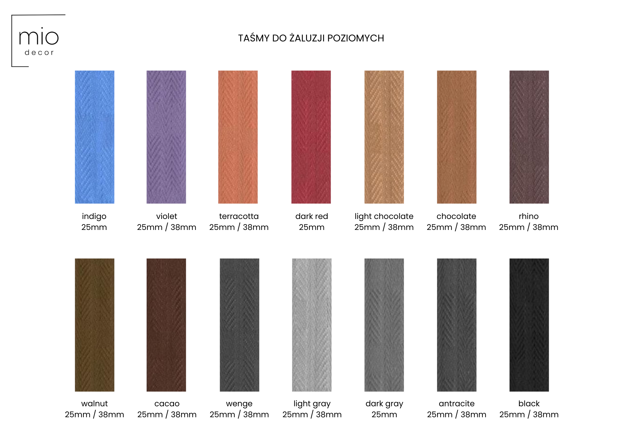 - taśmowa - taśma do żaluzji może być dopasowana do koloru lamel albo kontrastować się z nimi.